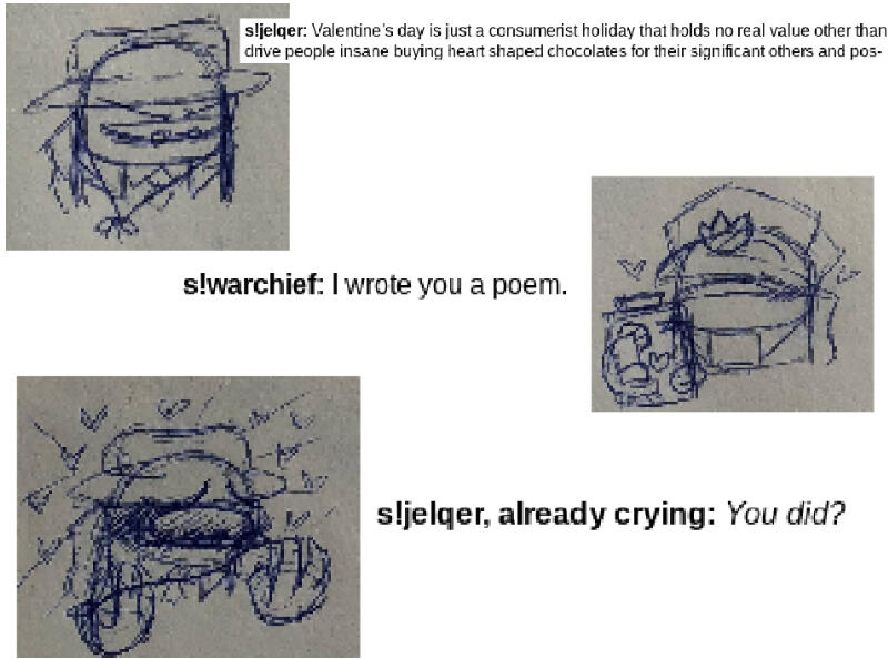 - purple tries to serenade pink from the vents with "despacito" at 3 am.